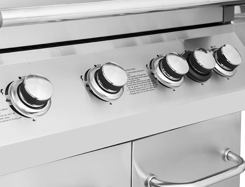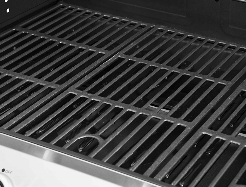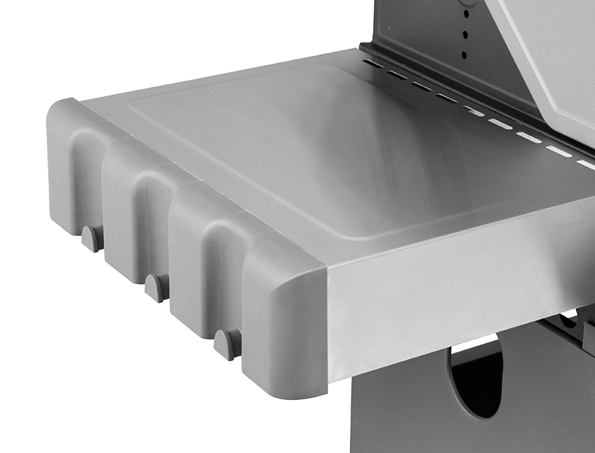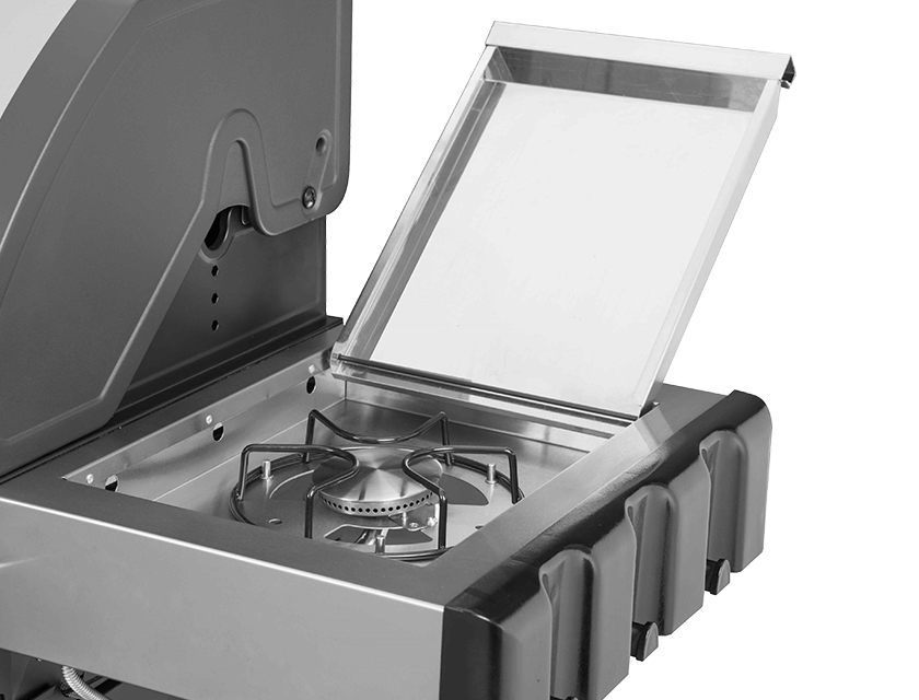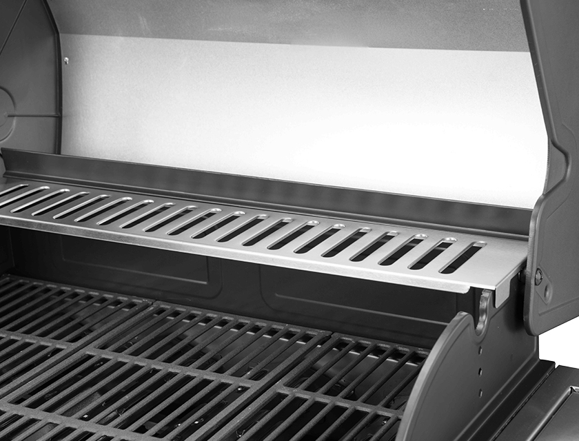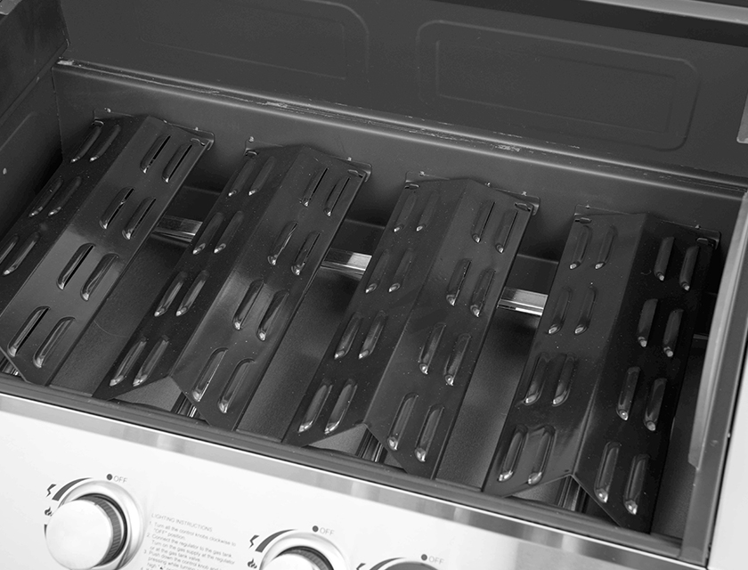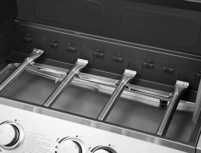 У газового гриля 4 основные горелки, оснащенные V-образными рассекателями пламени. Попадая на них, сок и маринад испаряются, придавая блюдам неповторимый вкус и аромат. Также рассекатели обеспечивают равномерное нагревание и защищают горелки от попадания жира, который может спровоцировать вспышку пламени.