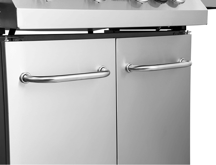 Также конструкция гриля предусматривает вместительный шкаф, в который поместится не только баллон, но и необходимая посуда или аксессуары. Для удобства использования по бокам гриля предусмотрены столики.