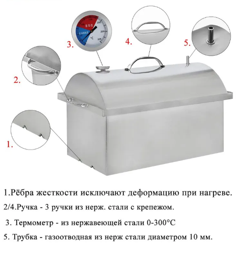 Технические характеристики Тип: коптильня горячего копчения Материал корпуса и крышки: нержавеющая сталь AISI 304 Материал решёток: нержавеющая сталь AISI 304 Масса коптильни: 10 кг Толщина стенок корпуса: 2 мм Толщина крышки: 1,5 мм Габаритные размеры (Д×Ш×В): 450×300×300 мм Внутренние размеры (Д×Ш×В): 400×250×260 мм Количество ярусов: 2 Поддон для сбора жира: есть Рёбра жёсткости: есть