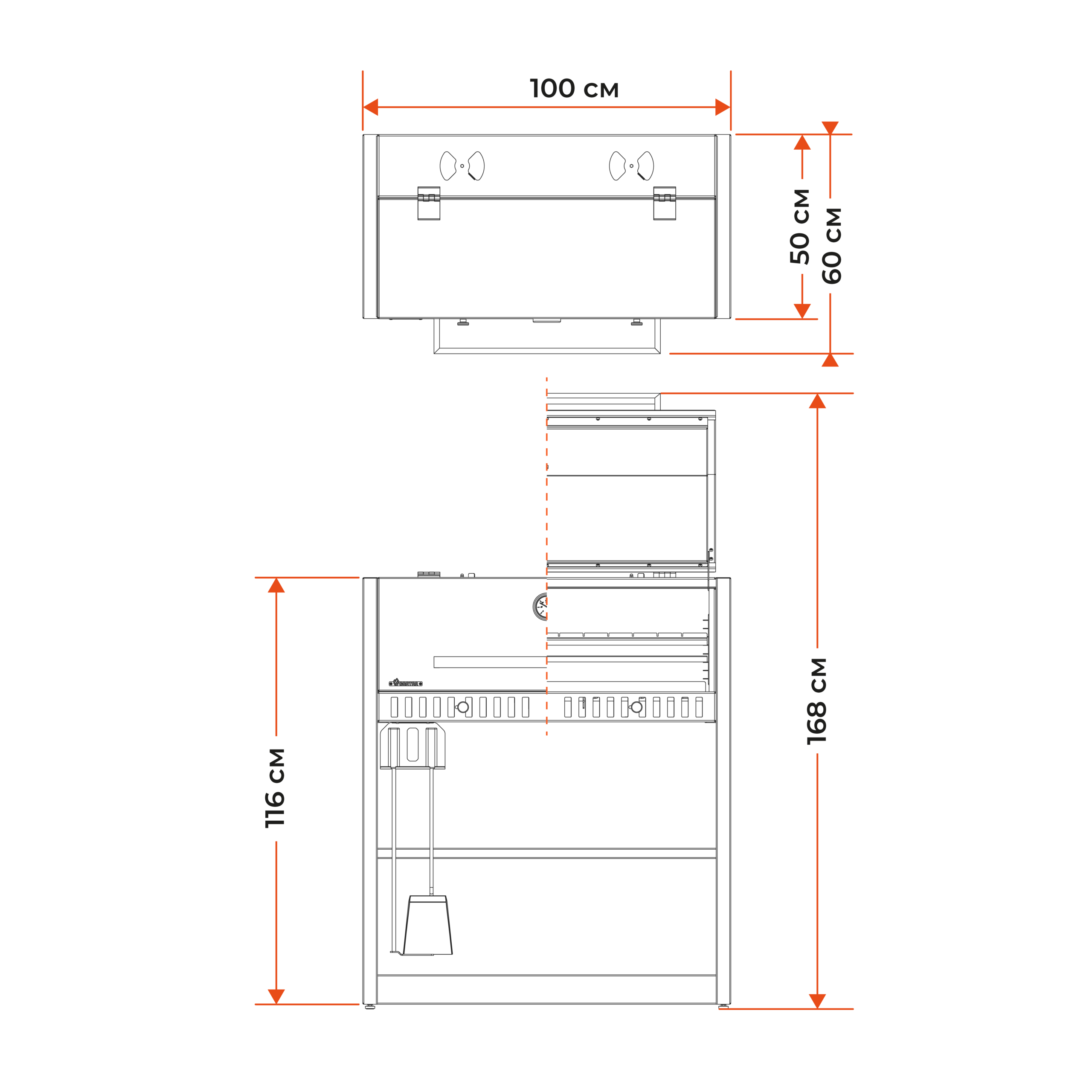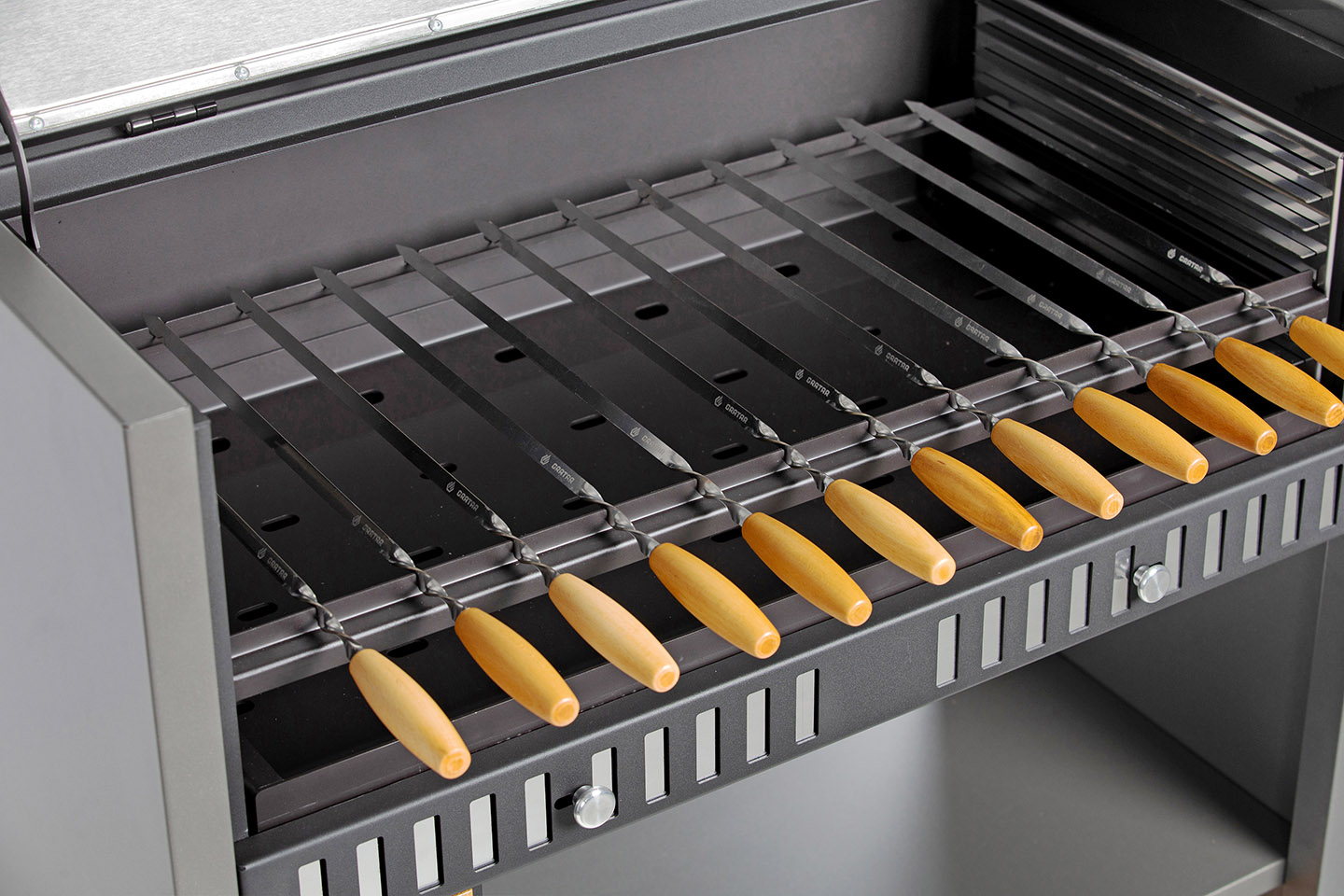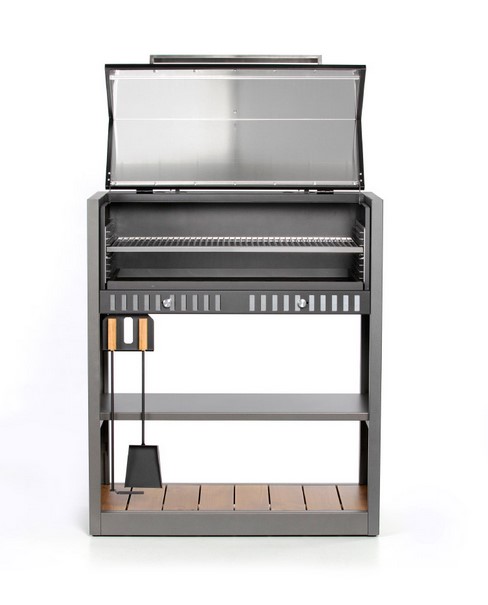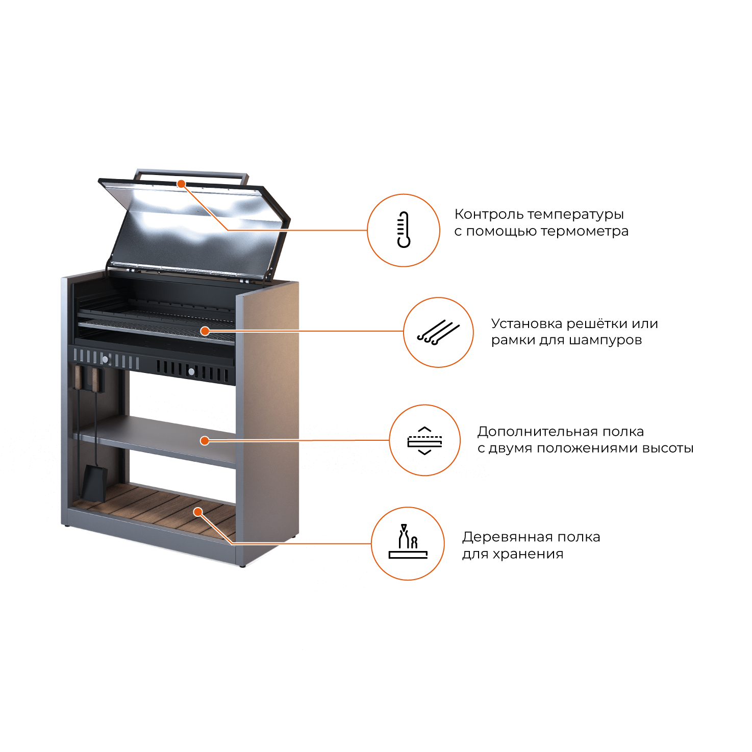 Гриль состоит из основания с двумя полками: деревянной и металлической. Корпус гриля изготовлен из стали толщиной 2 мм и усилен ребрами жесткости. Угольный ящик изготовлен из стали 3 мм, что гарантирует грилю очень долгий срок службы.Крышка и боковины c дополнительной термоизоляцией.