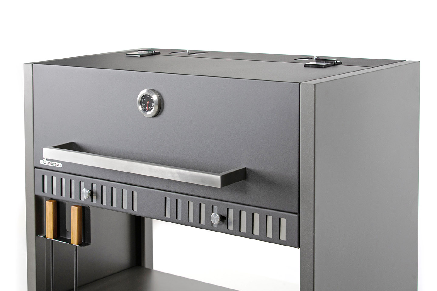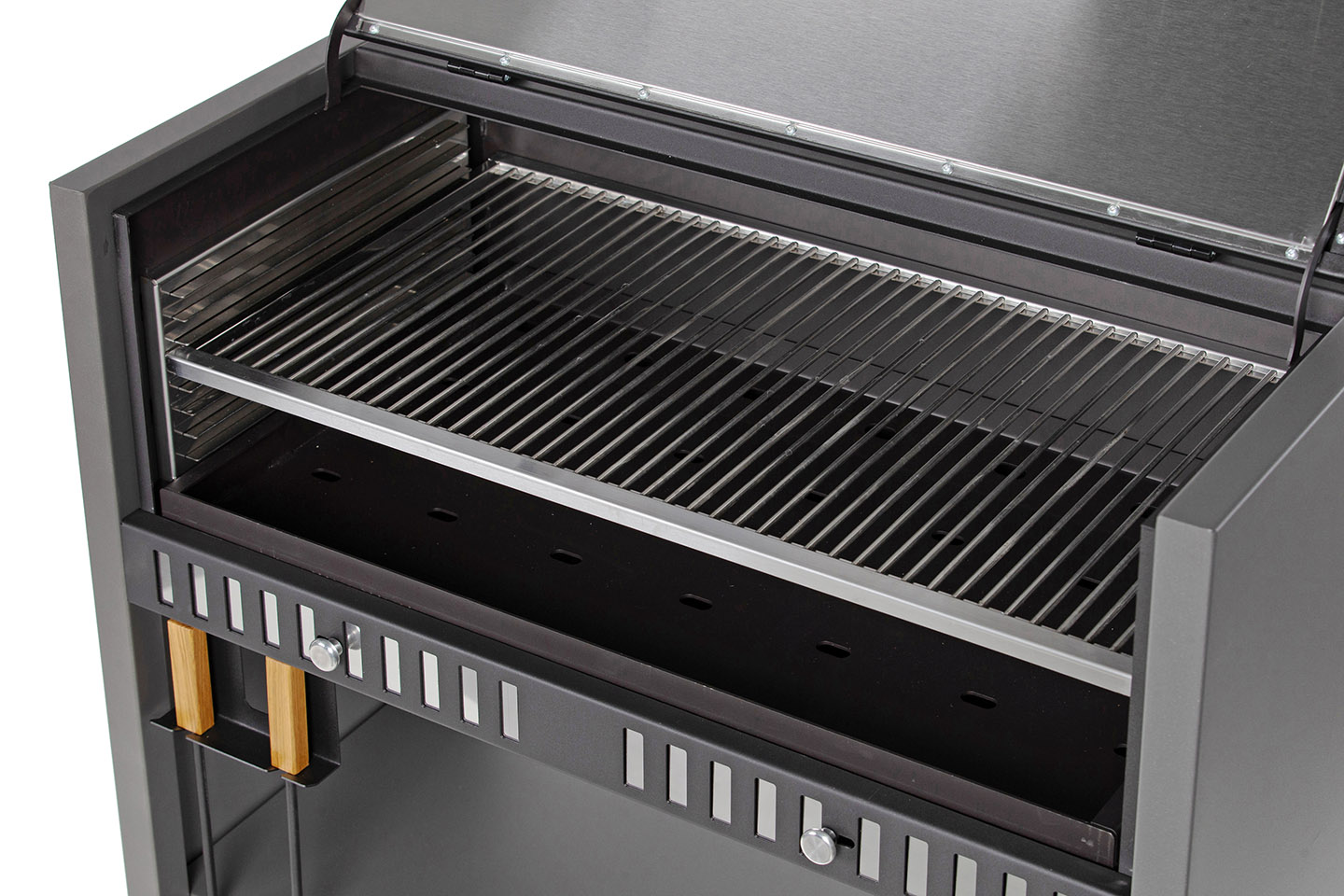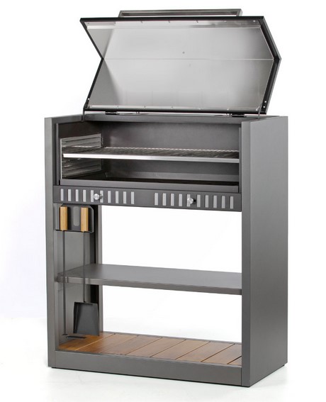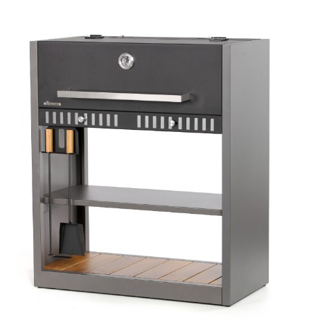 Гриль состоит из основания с двумя полками: деревянной и металлической. Корпус гриля изготовлен из стали толщиной 2 мм и усилен ребрами жесткости. Угольный ящик изготовлен из стали 3 мм, что гарантирует грилю очень долгий срок службы.Крышка и боковины c дополнительной термоизоляцией.