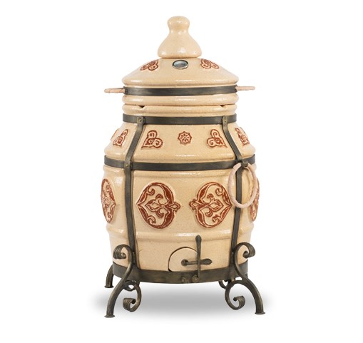 Тандыр покрыт матовой глазурью синего цвета. Ручки — натуральная кожа чёрного цвета. Всем известная народная мудрость гласит «Восток — дело тонкое». Вот и нам для создания среднего, по нашим меркам, тандыра потребовалось максимум усилий для того, чтобы сделать на самом деле изящный, удобный тандыр. Тандыр Тамерлан сделан в классической для восточных тандыров форме бочки. В итоге, тандыр быстро растапливается, вмещает достаточно большие поленья дров и быстро прогревается. Широкая горловина позволяет использовать различные аксессуары, а также запекать на стенках тандыра лепешки или самсу. Шашлык из ЭКО Тандыра Тамерлан, запеченные овощи гриль, баранья нога в тандыре — все приведет вас и ваших гостей в кулинарный восторг. Тандыр Тамерлан — это достойный подарок себе, другу, а может и шефу.
